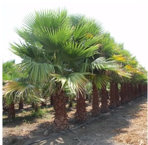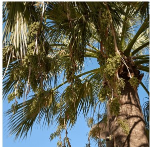 • El penacho, en óptimas condiciones, llega a tener hasta 20 hojas verdes; y al caer cubren la parte superior del tronco, el color de las hojas es más oscuro y grisáceo.